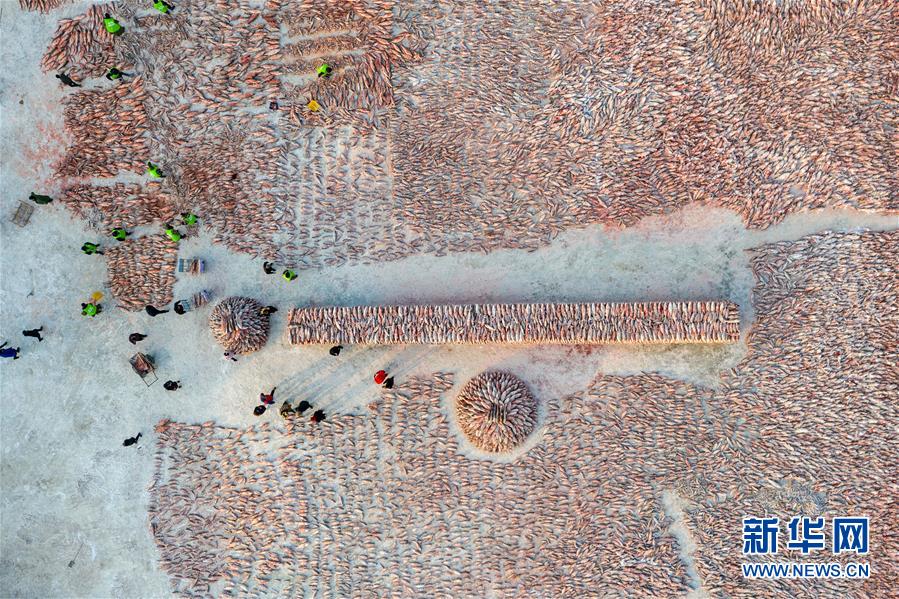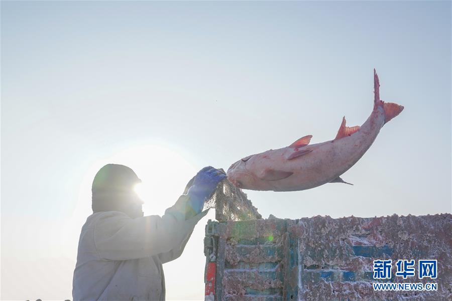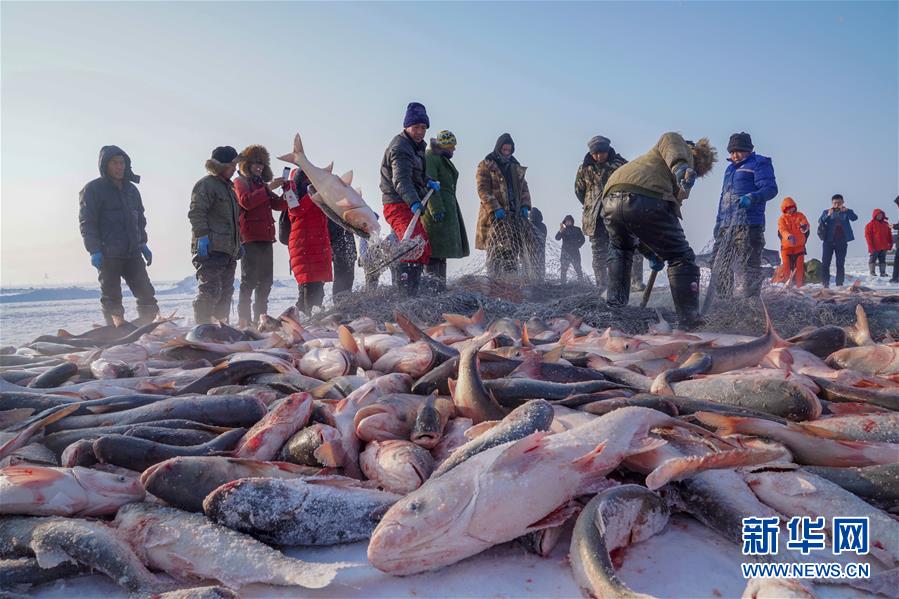 12月27日,在查干湖冰面上,工人將剛打撈上來(lái)的大魚(yú)扔上貨車(chē)。新華社記者張楠攝