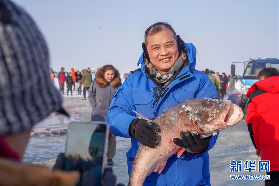 12月27日,在查干湖冰面上,游客手捧剛打撈上來(lái)的大魚(yú)拍照留念。新華社記者張楠攝