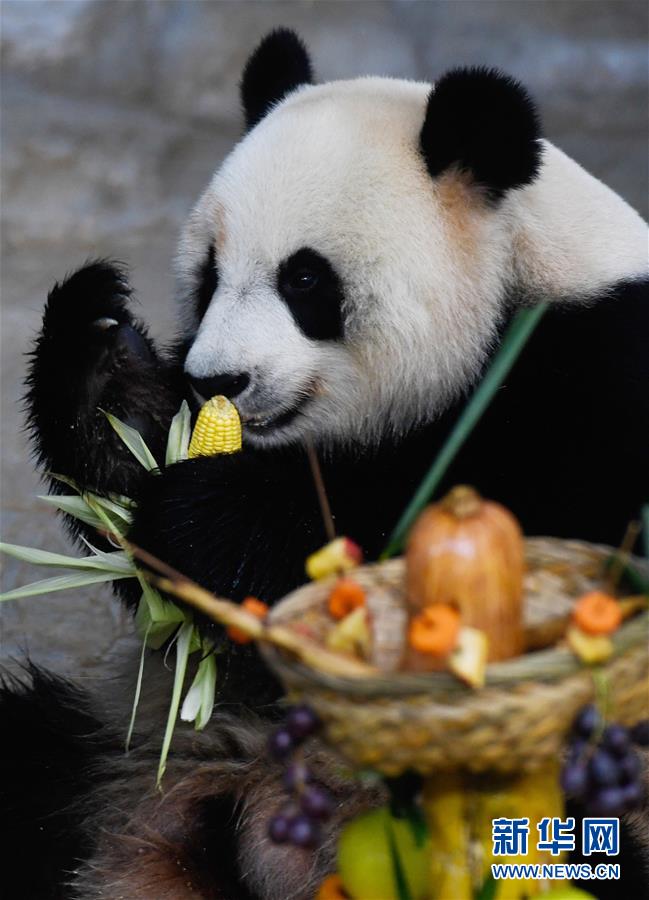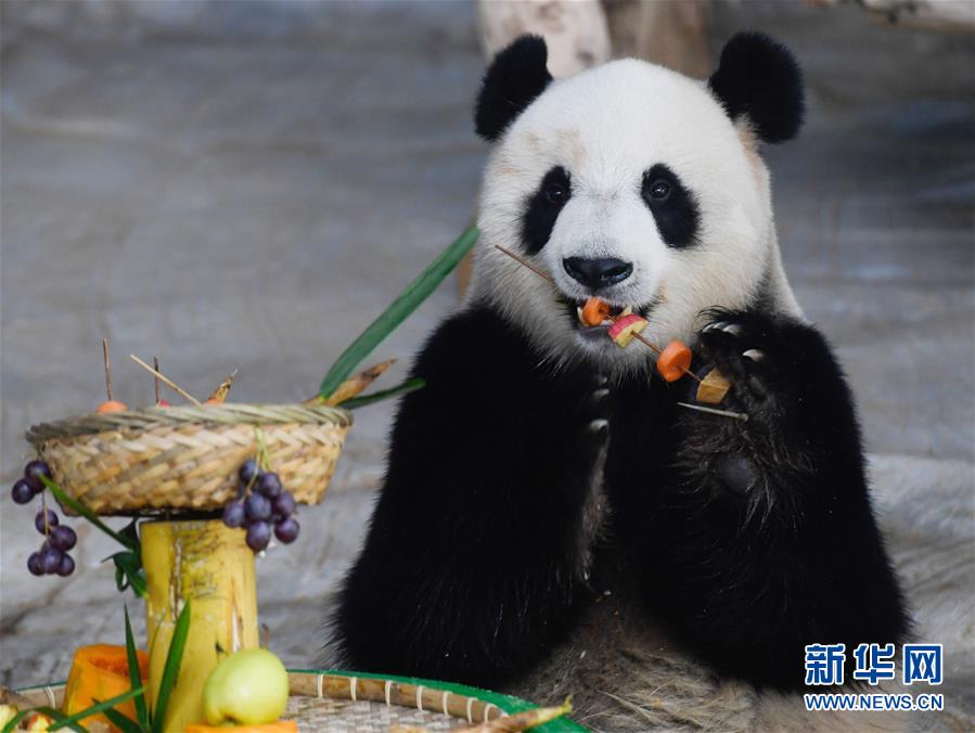 當(dāng)日是2019年最后一天,海南熱帶野生動(dòng)植物園的工作人員為園區(qū)內(nèi)大熊貓“貢貢”“舜舜”準(zhǔn)備了用葡萄、南瓜、竹筍等果蔬制作的“火鍋串串香”,讓它們用“擼串”的方式迎接新年的到來(lái)。 新華社記者 楊冠宇 攝