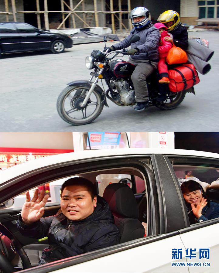 拼版照片:上圖是董日旭帶著家人騎摩托車返鄉(xiāng)過(guò)年(資料照片,2013年2月2日攝),下圖是董日旭開著他新買的汽車,帶家人來(lái)到中國(guó)石油泉州博覽大道加油站領(lǐng)加油卡(1月15日新華社記者魏培全攝)。