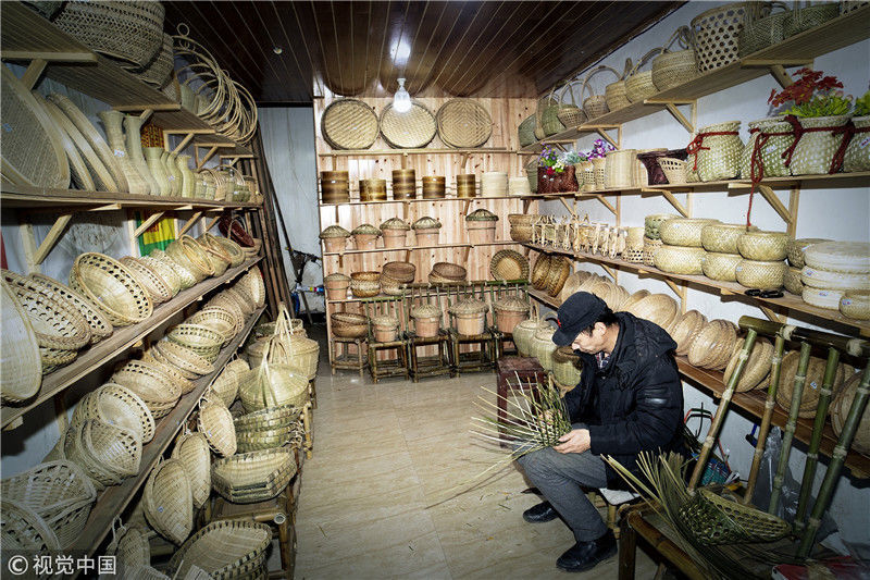 2019年1月26日,重慶中山古鎮(zhèn),880桌“千米長(zhǎng)宴”5萬(wàn)人共品年味。古鎮(zhèn)居民們編制的竹編制品。