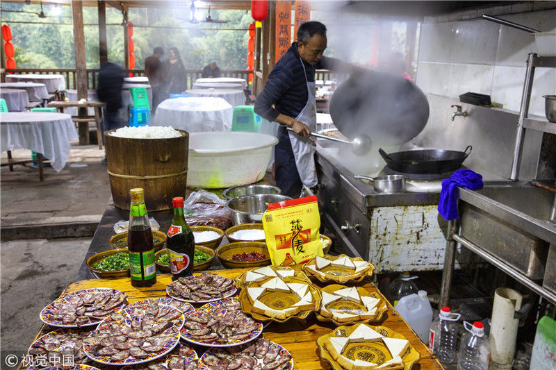 2019年1月26日,重慶中山古鎮(zhèn),880桌“千米長(zhǎng)宴”5萬(wàn)人共品年味。街坊們?cè)陬^天就開(kāi)始準(zhǔn)備各種菜肴與小吃。