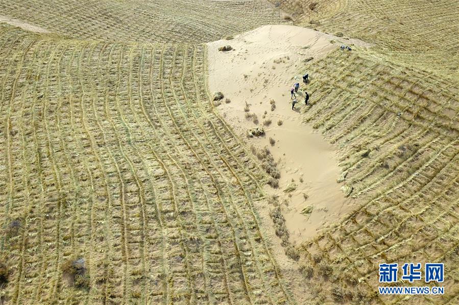 3月5日,在古浪縣北部沙區(qū)旱麻崗治沙點(diǎn),群眾扎草方格壓沙(無人機(jī)照片)。初春時節(jié),在騰格里沙漠南緣的甘肅省武威市古浪縣,當(dāng)?shù)馗刹柯毠ぜ鞍瞬缴沉謭鲋紊橙斯餐诳h城北部沙區(qū)旱麻崗治沙點(diǎn)開展春季治沙勞動。新華社記者 范培珅 攝