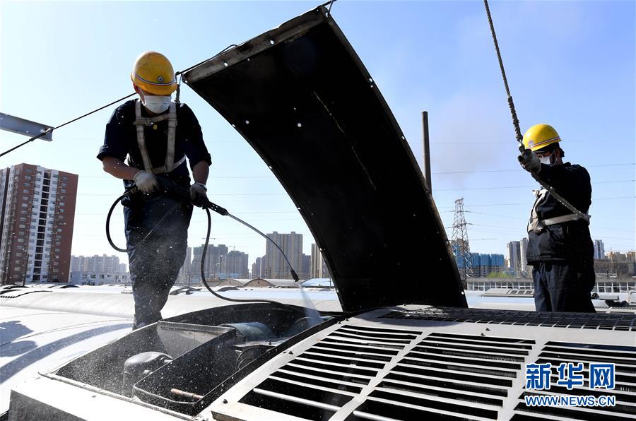 3月19日,鄭州車(chē)輛段客車(chē)檢車(chē)員在對(duì)客車(chē)空調(diào)機(jī)組蒸發(fā)器、壓縮機(jī)等內(nèi)部設(shè)備進(jìn)行清洗。新華社記者 李安 攝