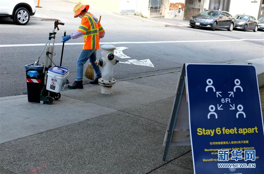 3月20日,一名清潔工在美國加利福尼亞州舊金山唐人街打掃衛(wèi)生。 新華社記者吳曉凌攝