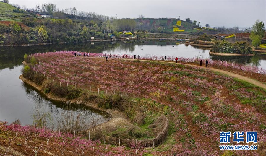 3月22日,游人在柳山湖的桃花島上游覽(無人機(jī)照片)。陽(yáng)春三月,陜西省漢中市洋縣龍亭鎮(zhèn)柳山村,1300畝桃園的花朵綻放。新華社記者陶明攝