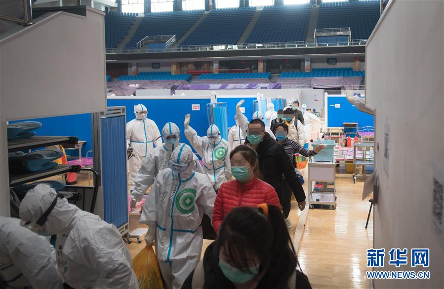 3月10日,在武漢江夏方艙醫(yī)院,醫(yī)護(hù)人員幫助新冠肺炎治愈患者(中)拿行李。新華社記者才揚(yáng)攝