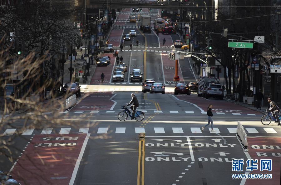 3月21日,在美國紐約第二大道,人們戴口罩騎車出行。美國紐約州、伊利諾伊州、康涅狄格州20日發(fā)布針對本州居民的“居家令”,以遏制新冠病毒傳播。這些“居家令”涵蓋紐約、洛杉磯、芝加哥等大城市,影響數(shù)千萬人。白宮20日發(fā)表聲明說,總統(tǒng)特朗普已宣布紐約州出現(xiàn)“重大災(zāi)難”,命令聯(lián)邦政府支援該州抗擊新冠肺炎疫情。新華社記者王迎攝
