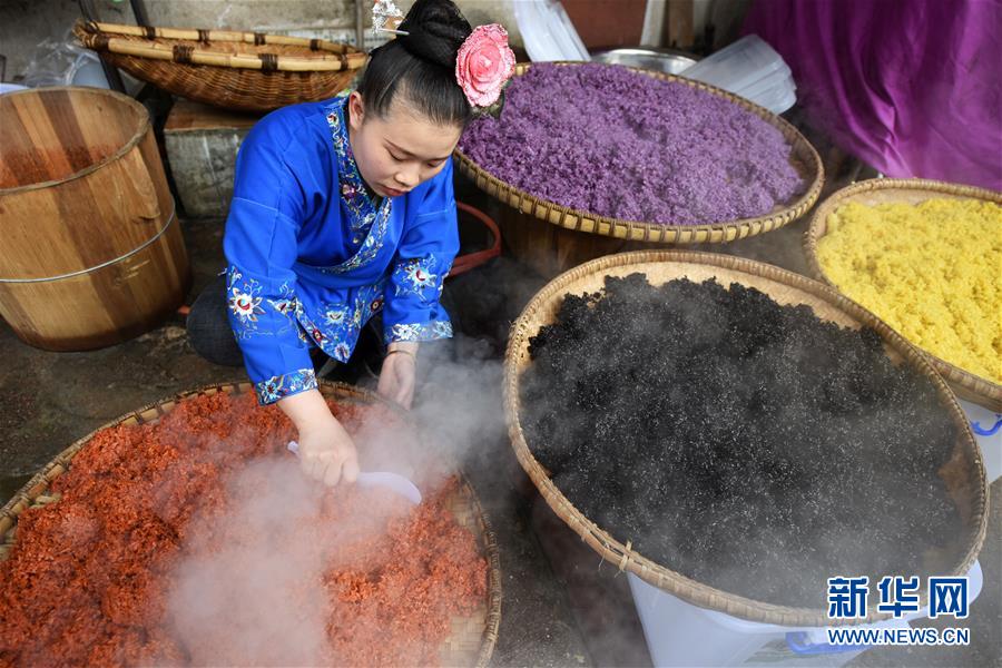 3月25日,在廣西上林縣巷賢鎮(zhèn),一名壯族女子在蒸制五色糯米飯。新華社記者陸波岸攝
