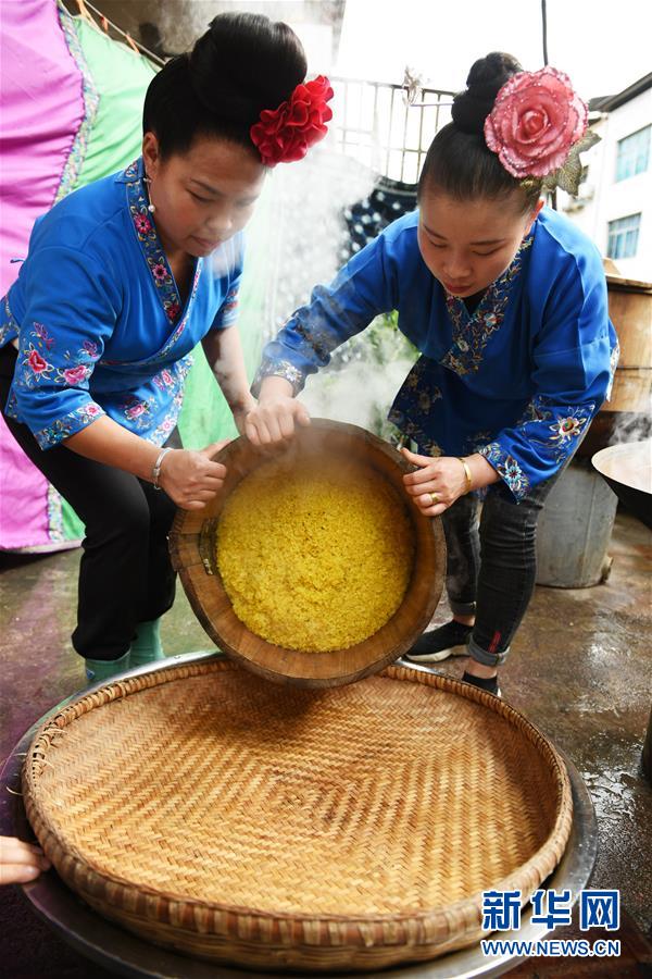 4月17日,在貴州省臺(tái)江縣姊妹街哆蝶五彩姊妹飯?bào)w驗(yàn)店,苗家婦女在蒸煮五彩“姊妹飯”。新華社記者楊文斌攝