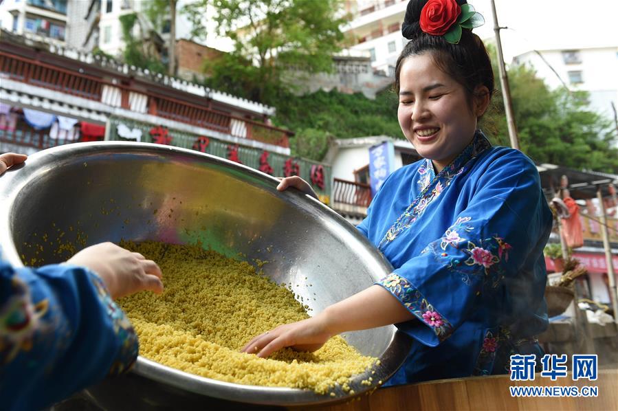4月16日,在貴州省臺(tái)江縣姊妹街哆蝶五彩姊妹飯?bào)w驗(yàn)店,苗家婦女在制作五彩“姊妹飯”。新華社發(fā)(劉開福攝)