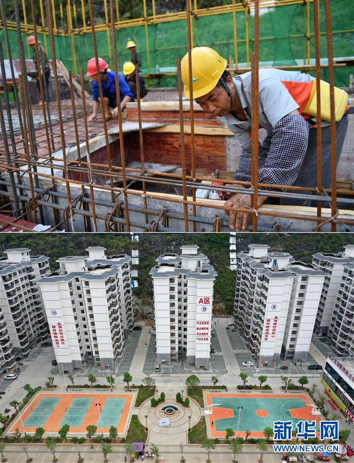 拼版照片:上圖為工人在廣西都安瑤族自治縣八仙易地扶貧搬遷安置新區(qū)項目施工(2016年7月25日攝);下圖為已經(jīng)建成入住的廣西都安瑤族自治縣八仙易地扶貧搬遷安置新區(qū)部分樓房(無人機(jī)照片,2019年10月16日攝)。新華社記者陸波岸攝
