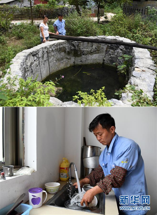 拼版照片:上圖為在廣西都安瑤族自治縣下坳鎮(zhèn)加八村龍力屯,袁朝強(qiáng)(右)和妻子羅蘭香站在水井邊(2017年10月12日攝);下圖為在廣西都安瑤族自治縣下坳鎮(zhèn)車家莊扶貧搬遷安置新區(qū),袁朝強(qiáng)在自家新房里使用自來水洗碗(2017年10月12日攝)。新華社記者陸波岸攝
