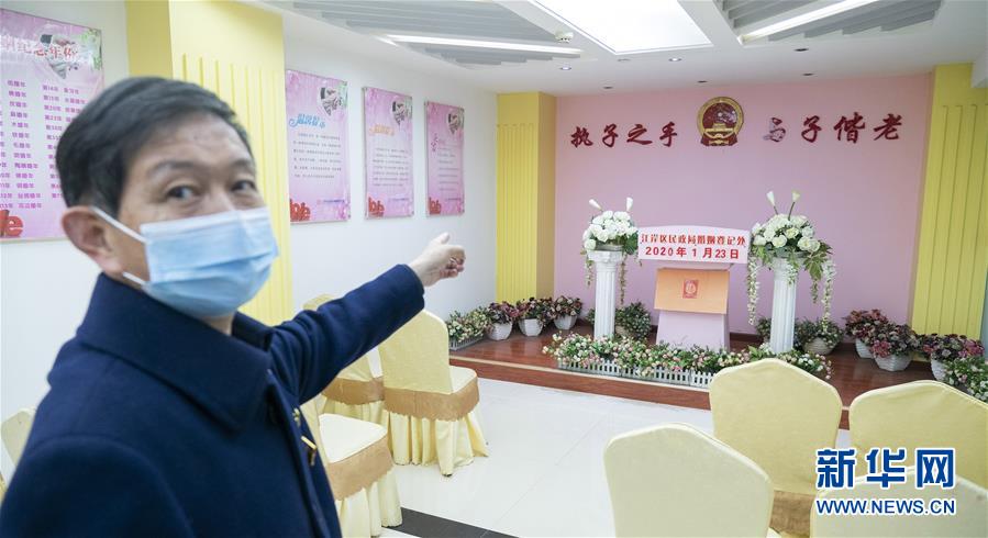 4月7日,武漢市江岸區(qū)民政局婚姻登記處工作人員介紹頒證廳,疫情期間這里暫停使用。 新華社記者才揚(yáng)攝