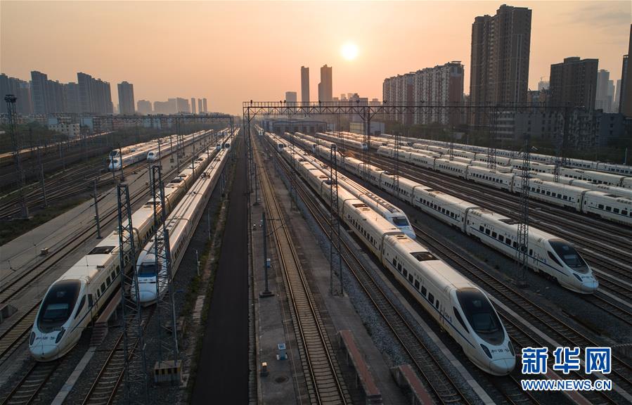4月8日,在武漢動車段,列車??吭诖孳嚲€上準備投入運行(無人機照片)。新華社記者肖藝九攝