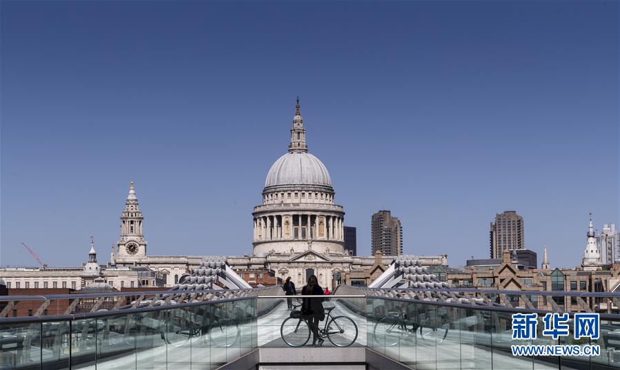 4月14日,一名女子在英國倫敦的千禧橋上駐足,眺望遠處的圣保羅大教堂。新華社記者韓巖攝