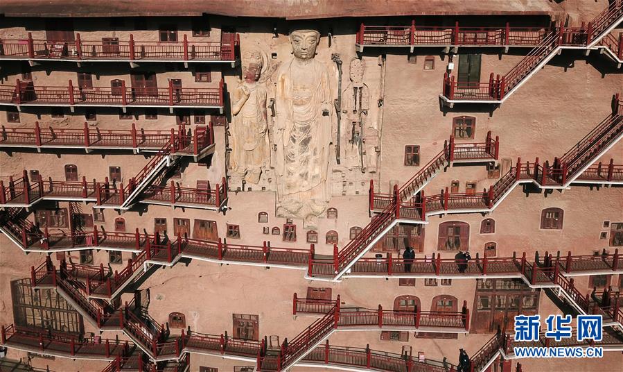 12月26日,游客在麥積山石窟參觀游覽(無(wú)人機(jī)拍攝)。新華社記者馬寧攝