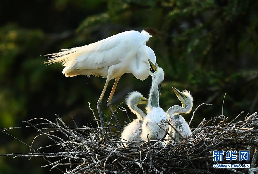 在南昌市新建區(qū)象山森林公園內(nèi),一只白鷺在鳥巢內(nèi)給幼鳥喂食(4月27日攝)。近日,在江西省南昌市新建區(qū)象山森林公園內(nèi),已安家筑巢的大批白鷺進(jìn)入繁殖旺季。在夕陽的照耀下,白鷺時(shí)而翩翩起舞,時(shí)而展翅盤旋,構(gòu)成一幅美麗的自然生態(tài)畫卷。新華社記者萬象攝