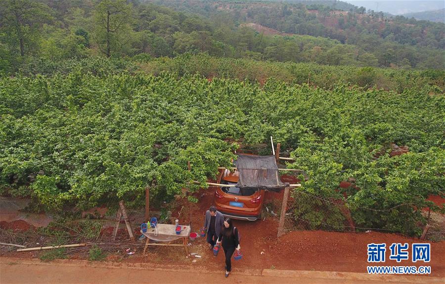 4月28日,游客從云南省富民縣赤鷲鎮(zhèn)普橋村櫻桃園走出(無人機照片)。云南省富民縣赤鷲鎮(zhèn)大力發(fā)展特色種植業(yè),全鎮(zhèn)種植櫻桃4000余畝,幫助當(dāng)?shù)剞r(nóng)民增收致富。新華社記者楊宗友攝