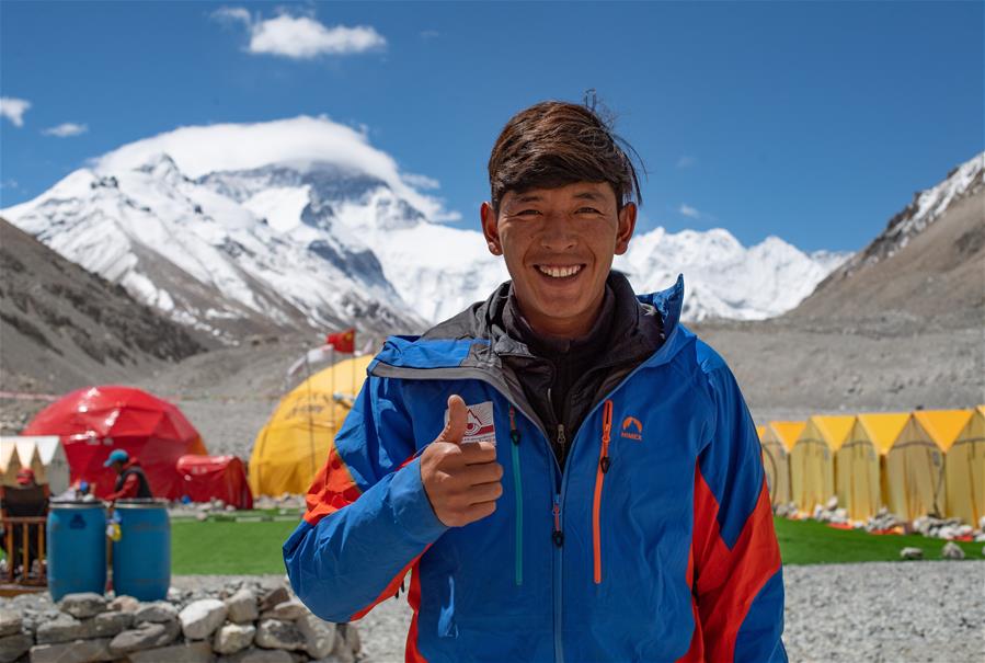 西藏圣山公司高山向?qū)赚旑D珠在珠峰大本營(5月8日攝)。5月8日是世界微笑日。在海拔5200米的珠峰大本營,參與2020珠峰高程測量的各方人員,微笑期待本次測量活動(dòng)的圓滿成功。