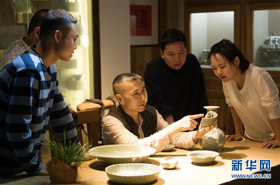5月8日,項(xiàng)宏金(左一)在龍泉青瓷裝飾紋樣研究所向來(lái)訪的年輕瓷人介紹一件貫耳瓶。1965年出生的項(xiàng)宏金,被浙江龍泉年輕一代瓷人稱為“項(xiàng)哥”,他從20世紀(jì)90年代開(kāi)始收集龍泉青瓷標(biāo)本,研究青瓷紋樣。2014年出版著作《龍泉青瓷裝飾紋樣》,次年開(kāi)設(shè)龍泉青瓷裝飾紋樣研究所,將自己收藏的千余件標(biāo)本跟瓷器愛(ài)好者、創(chuàng)作者免費(fèi)分享。新華社記者翁忻旸攝