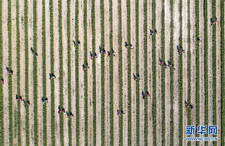 5月11日,采茶工在寧夏百瑞源賀蘭山基地采摘枸杞芽茶(無人機(jī)照片)。當(dāng)日,寧夏百瑞源賀蘭山基地枸杞芽茶全面進(jìn)入采摘季。據(jù)了解,該基地茶園面積300余畝,助力附近200多名農(nóng)民就業(yè)增收。新華社記者楊植森攝
