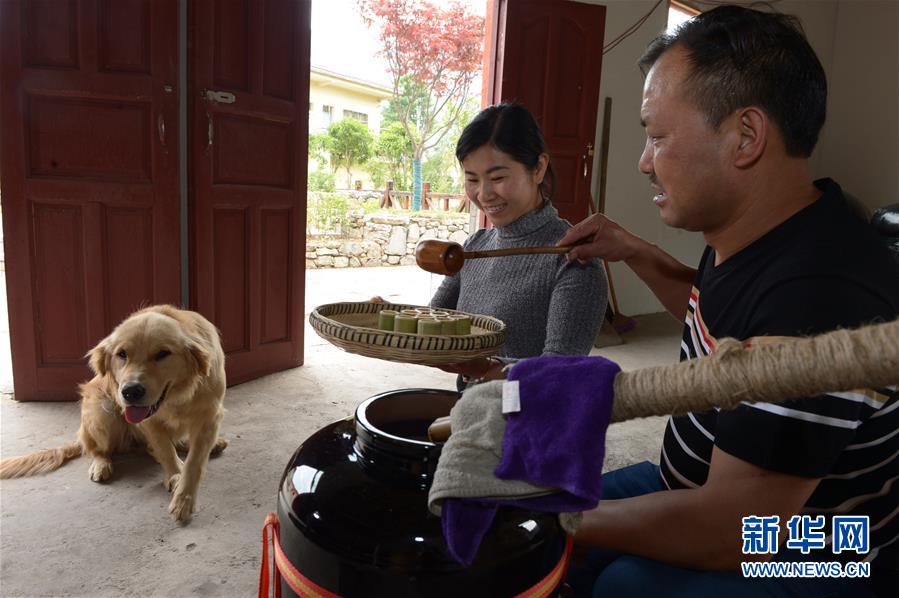 5月14日,在貴州省畢節(jié)市百里杜鵑管理區(qū)黃泥鄉(xiāng)龍?zhí)链逡患揖谱鞣?,村民對玉米進行發(fā)酵。貴州省畢節(jié)市百里杜鵑管理區(qū)黃泥鄉(xiāng)龍?zhí)链宓凝執(zhí)凉啪?,因獨特的古法釀酒技術,口感獨特而遠近聞名。全村有釀酒戶142戶,年產量達45萬多公斤,龍?zhí)凉啪七h銷重慶、廣東、浙江等地,龍?zhí)凉啪埔殉蔀辇執(zhí)寥嗽鍪盏闹匾獊碓?。新華社記者楊楹攝