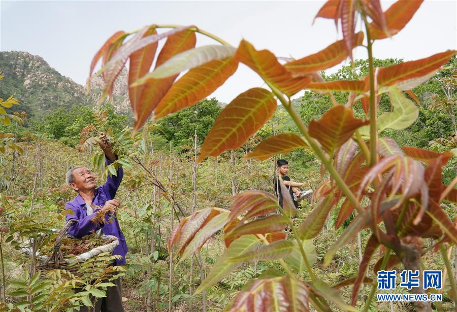 5月17日,秦皇島市撫寧區(qū)王家灣村的村民在自家香椿園采摘香椿芽。近年來,河北省秦皇島市撫寧區(qū)王家灣村村委會帶領村民在坡嶺荒地種植紅香椿樹1000多畝,綠化了荒坡荒地,增加了農(nóng)民收入。新華社記者楊世堯攝