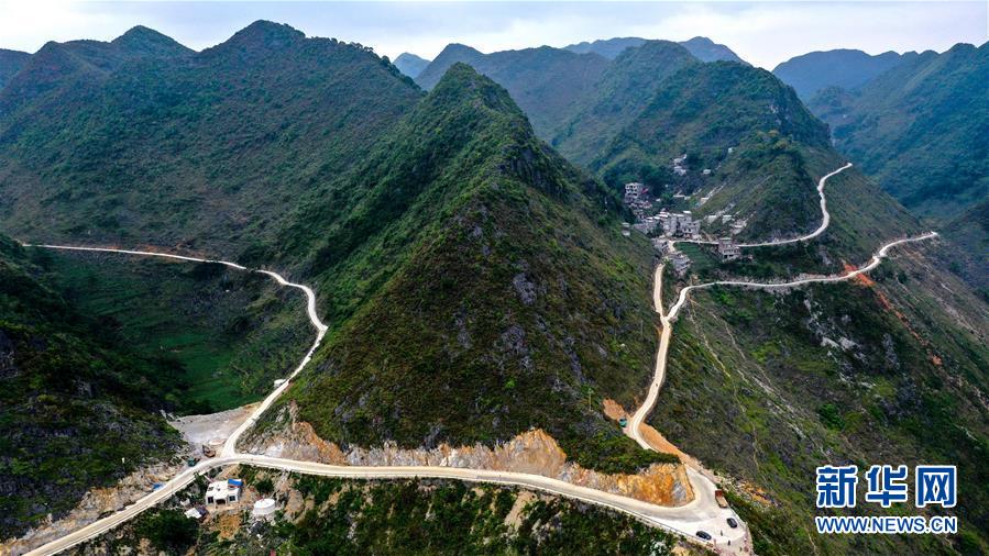 這是大化瑤族自治縣七百弄鄉(xiāng)弄合村弄根屯在進(jìn)行危房改造和修建進(jìn)屯路(5月13日攝,無(wú)人機(jī)照片)。