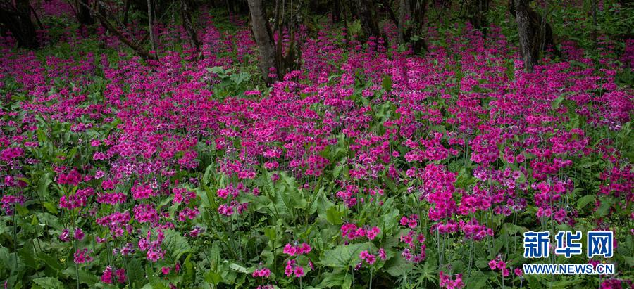 四川省漢源縣桌子山上的報(bào)春花遍地綻放(5月24日攝)。新華社記者江宏景攝