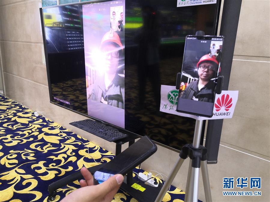 在山西陽煤集團新元煤礦調度中心,記者通過5G網(wǎng)絡視頻采訪井下礦工(5月27日手機拍攝)。新華社記者梁曉飛攝