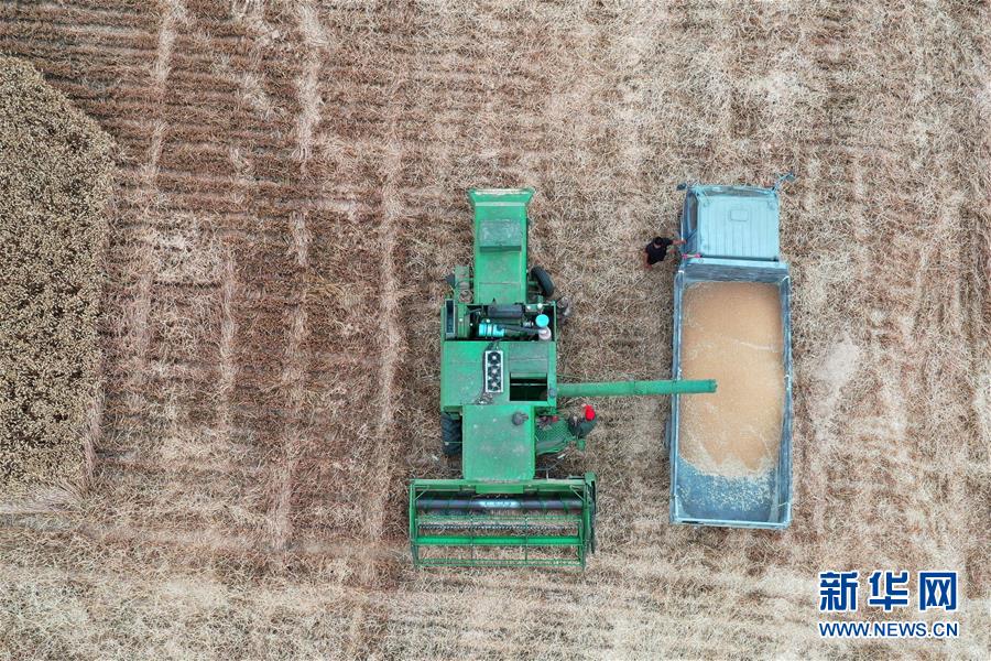 6月2日,在河南省黃泛區(qū)農(nóng)場九分場的麥田里,農(nóng)民操作大型收割機收獲小麥(無人機照片)。新華社記者李嘉南攝。