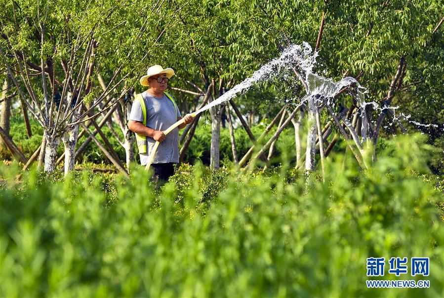 6月5日,在文安縣迎賓大道,工人給花池澆水。近年來,河北省文安縣將植樹造林與城市建設(shè)有機融合,探索“政府引導(dǎo)、企業(yè)運作、多方共贏”的市場化植樹造林新模式,大規(guī)模推進國土綠化,打造人與自然和諧共生的優(yōu)美生態(tài)環(huán)境,構(gòu)筑京津雄綠色屏障。截至目前,該縣森林覆蓋率已經(jīng)達到33%,城區(qū)綠地面積達到36.48%。新華社記者李曉果攝。
