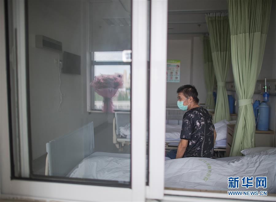 6月17日,胡定江在病房等待出院,窗臺的鮮花是他準(zhǔn)備在出院時送給醫(yī)護(hù)人員的。用過ECMO(人工膜肺)等設(shè)備,經(jīng)過多省市專家的聯(lián)合救治,在院100多天,先后經(jīng)歷了ICU、過渡病房、隔離病房、普通病房的40歲新冠肺炎康復(fù)患者胡定江,目前康復(fù)良好,經(jīng)專家研判,于6月17日出院。新華社記者肖藝九攝
