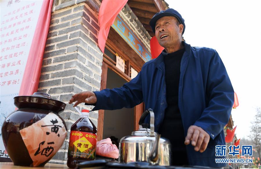 甘肅省平?jīng)鍪袥艽h涇明鄉(xiāng)白家村村民白貴元在自家黃酒鋪前張羅生意(3月19日攝)。新華社記者陳斌攝