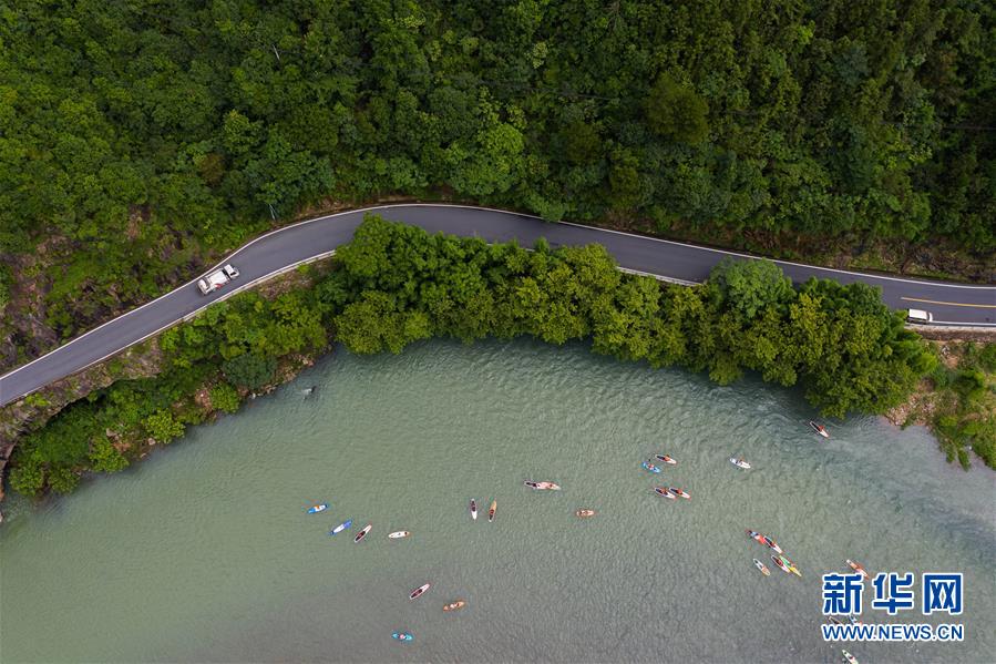水上運(yùn)動愛好者在杭州市富陽區(qū)湖源鄉(xiāng)的壺源溪上體驗(yàn)槳板運(yùn)動的樂趣(6月28日攝,無人機(jī)照片)。近期,浙江省杭州市富陽區(qū)場口鎮(zhèn)、常安鎮(zhèn)和湖源鄉(xiāng)組團(tuán)開啟了一場夏季“綠水青山嘉年華”。這幾個壺源溪流域鄉(xiāng)鎮(zhèn)整合生態(tài)旅游資源,組團(tuán)開發(fā)山村旅游項(xiàng)目,游客可以參與壺源溪水上游樂、露營永安山頂、特色農(nóng)產(chǎn)品集市和瓜果節(jié)等特色活動。新華社記者徐昱攝