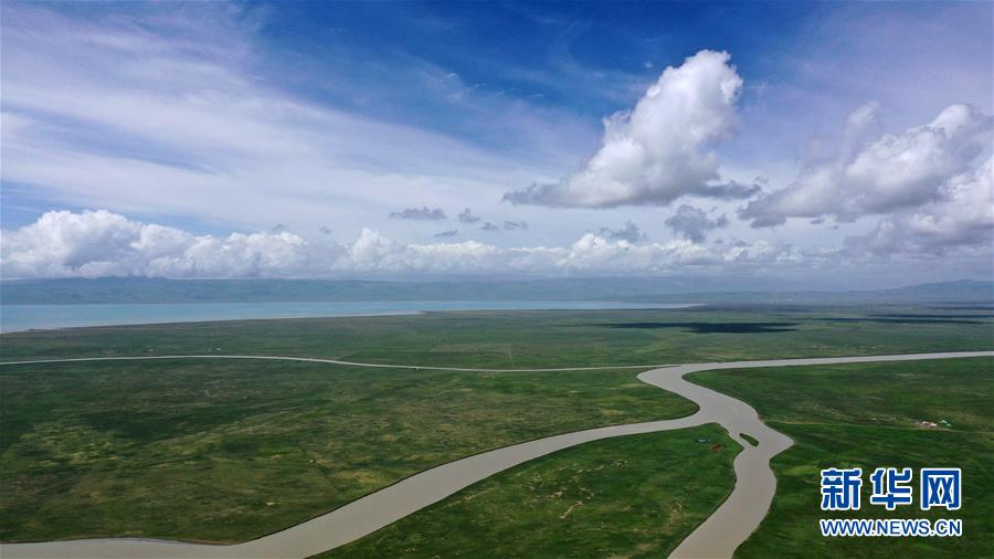 7月10日拍攝的青海湖畔風光(無人機照片)。盛夏時節(jié),被譽為“中國最美湖泊”的青海湖畔景色宜人,藍天、白云、湖水與草原組成一幅壯美的畫卷。新華社記者張宏祥攝
