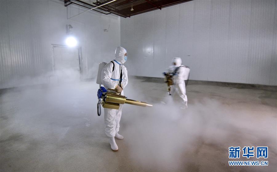 7月14日,北京二商肉類食品集團(tuán)有限公司員工對(duì)肉類冷藏庫房進(jìn)行全方位消毒。北京二商肉類食品集團(tuán)有限公司是保障北京肉類市場供應(yīng)的主要企業(yè)之一。新冠肺炎疫情以來,企業(yè)嚴(yán)格實(shí)施北京市、農(nóng)業(yè)農(nóng)村部和中國肉類協(xié)會(huì)的防疫要求,對(duì)進(jìn)入廠區(qū)的人員、車輛以及原料采購、屠宰分割、產(chǎn)品加工、貯藏運(yùn)輸、廢棄物收集及污水處理等生產(chǎn)環(huán)節(jié)嚴(yán)格防疫,強(qiáng)調(diào)源頭把關(guān)徹底消毒。目前,集團(tuán)公司下屬多家生豬屠宰加工基地正常運(yùn)營,保質(zhì)保量供應(yīng)北京市場需求。新華社記者 李欣 攝