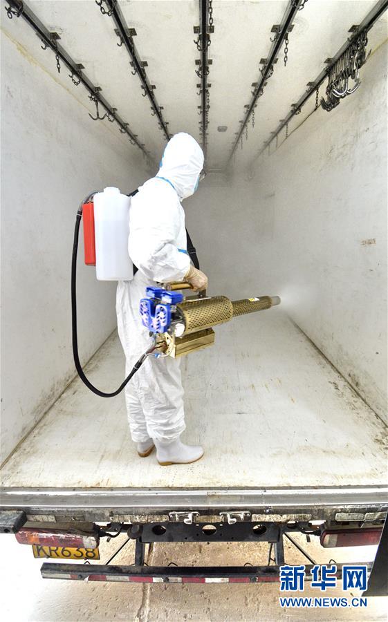 7月15日,北京二商肉類食品集團(tuán)有限公司員工對冷鏈運輸設(shè)備進(jìn)行消毒。北京二商肉類食品集團(tuán)有限公司是保障北京肉類市場供應(yīng)的主要企業(yè)之一。新冠肺炎疫情以來,企業(yè)嚴(yán)格實施北京市、農(nóng)業(yè)農(nóng)村部和中國肉類協(xié)會的防疫要求,對進(jìn)入廠區(qū)的人員、車輛以及原料采購、屠宰分割、產(chǎn)品加工、貯藏運輸、廢棄物收集及污水處理等生產(chǎn)環(huán)節(jié)嚴(yán)格防疫,強調(diào)源頭把關(guān)徹底消毒。目前,集團(tuán)公司下屬多家生豬屠宰加工基地正常運營,保質(zhì)保量供應(yīng)北京市場需求。新華社記者 李欣 攝