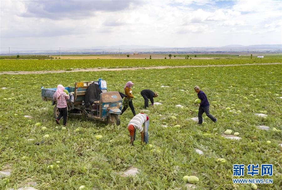 7月16日,在寧夏中衛(wèi)市香山鄉(xiāng)硒砂瓜萬畝示范基地,瓜農(nóng)在采收硒砂瓜。近日,寧夏中衛(wèi)市迎來硒砂瓜豐收季。硒砂瓜是中衛(wèi)市的特色農(nóng)產(chǎn)品,近年來,當?shù)夭扇〖夹g創(chuàng)新、規(guī)?;N植、休耕輪作等多項舉措,讓硒砂瓜種植成為當?shù)剞r(nóng)民增收致富的重要產(chǎn)業(yè)。據(jù)了解,今年中衛(wèi)市硒砂瓜種植面積為69.7萬畝。新華社記者楊植森攝