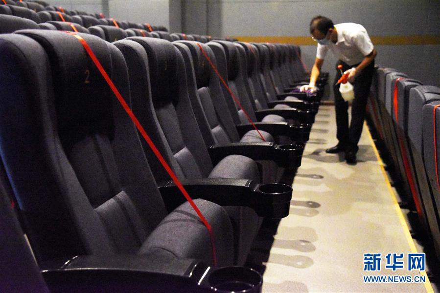7月20日,濟(jì)南新世紀(jì)電影城陽(yáng)光100店的員工在對(duì)影院設(shè)施進(jìn)行消殺。當(dāng)日,山東濟(jì)南市部分電影院在嚴(yán)格防控疫情的基礎(chǔ)上陸續(xù)恢復(fù)開放。新華社記者王凱攝
