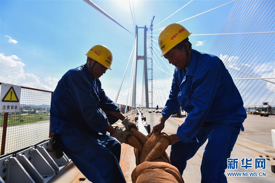 7月22日,施工人員在廣州南沙港鐵路跨西江特大斜拉橋進行最后一組斜拉索吊裝作業(yè)。新華社記者劉大偉攝