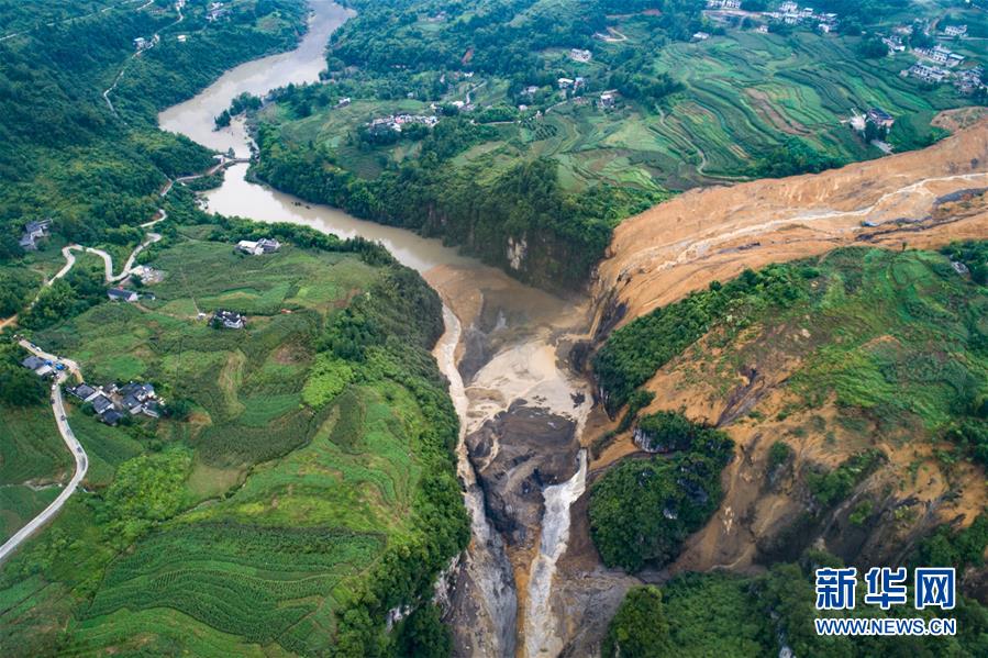 7月22日拍攝的因恩施州屯堡鄉(xiāng)馬者村山體滑坡形成的堰塞湖(無人機(jī)照片)。新華社記者肖藝九攝