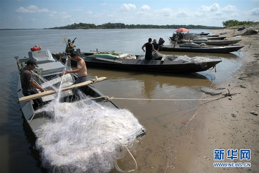 7月22日,在二道江灘地,八岔村的赫哲族村民在整理漁網(wǎng)。新華社記者王建威攝