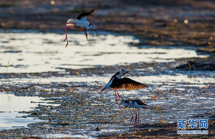 7月28日,在鄂爾多斯?jié)竦靥伊R—阿拉善灣海子,兩只長(zhǎng)腳鷸在爭(zhēng)斗。鄂爾多斯?jié)竦匚挥趲觳箭R沙漠、毛烏素沙地接壤地帶,2002年被列入國(guó)際重要濕地名錄。從2006年開始,由于濕地湖面萎縮、湖心島消失,在此筑巢繁殖的世界瀕危物種遺鷗幾近消失。近年來,當(dāng)?shù)夭扇《喾N治理措施,濕地生態(tài)環(huán)境逐步好轉(zhuǎn)。2019年起,濕地內(nèi)的桃力廟—阿拉善灣海子迎來遺鷗大規(guī)?!盎貧w”。如今,40多種鳥類在此棲息,鄂爾多斯?jié)竦刂匦鲁蔀轼B類的樂園。新華社記者連振攝