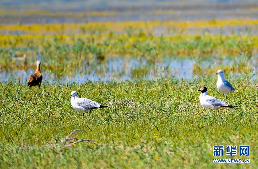 7月28日,灰雁和遺鷗在桃力廟—阿拉善灣海子覓食。鄂爾多斯?jié)竦匚挥趲觳箭R沙漠、毛烏素沙地接壤地帶,2002年被列入國(guó)際重要濕地名錄。從2006年開始,由于濕地湖面萎縮、湖心島消失,在此筑巢繁殖的世界瀕危物種遺鷗幾近消失。近年來,當(dāng)?shù)夭扇《喾N治理措施,濕地生態(tài)環(huán)境逐步好轉(zhuǎn)。2019年起,濕地內(nèi)的桃力廟—阿拉善灣海子迎來遺鷗大規(guī)?!盎貧w”。如今,40多種鳥類在此棲息,鄂爾多斯?jié)竦刂匦鲁蔀轼B類的樂園。新華社記者彭源攝
