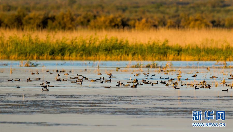 7月28日,成群候鳥在桃力廟—阿拉善灣海子覓食。鄂爾多斯?jié)竦匚挥趲?kù)布齊沙漠、毛烏素沙地接壤地帶,2002年被列入國(guó)際重要濕地名錄。從2006年開始,由于濕地湖面萎縮、湖心島消失,在此筑巢繁殖的世界瀕危物種遺鷗幾近消失。近年來(lái),當(dāng)?shù)夭扇《喾N治理措施,濕地生態(tài)環(huán)境逐步好轉(zhuǎn)。2019年起,濕地內(nèi)的桃力廟—阿拉善灣海子迎來(lái)遺鷗大規(guī)模“回歸”。如今,40多種鳥類在此棲息,鄂爾多斯?jié)竦刂匦鲁蔀轼B類的樂園。新華社記者連振攝