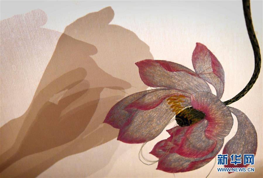 在開封市素花宋繡工藝有限公司的展示館里,王素花的徒弟劉冬紅在刺繡(7月30日攝)。新華社記者李嘉南攝