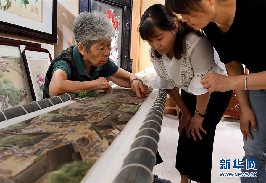 在開(kāi)封市素花宋繡工藝有限公司的展示館里,王素花指出徒弟們繡品上需要修改的地方(7月30日攝)。新華社記者李安攝