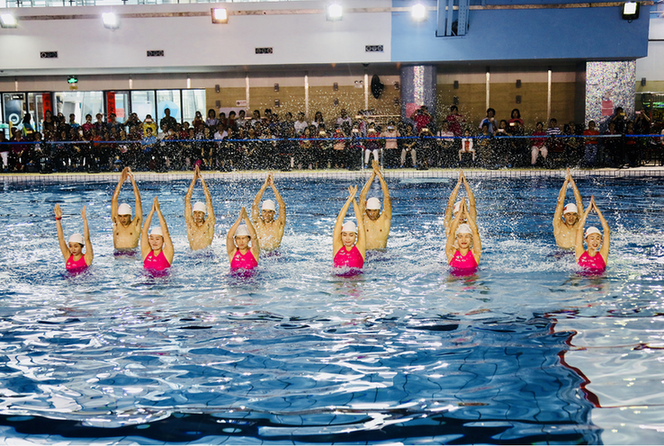 活動(dòng)伊始,來(lái)自廣州體育學(xué)院的水中健身操教練團(tuán)隊(duì)為大家?guī)?lái)了精彩的水中集體徒手操、水中集體太極、水中集體恰恰、水中集體健身棒操、水中集體深水操表演。接下來(lái)的體驗(yàn)時(shí)間,身著泳衣的學(xué)員們?cè)趯I(yè)教練的指導(dǎo)下進(jìn)行熱身活動(dòng)。十分鐘左右的熱身活動(dòng)結(jié)束后,學(xué)員們走下泳池踩著音樂的節(jié)拍于水中體驗(yàn)水中游戲、健身徒手操、手中太極等課程,學(xué)員們?cè)诮叹毜膸?dòng)下,熱情的學(xué)習(xí)跑、跳、拉伸等動(dòng)作,利用水的阻力、浮力和傳熱性進(jìn)行全身耗氧運(yùn)動(dòng)。